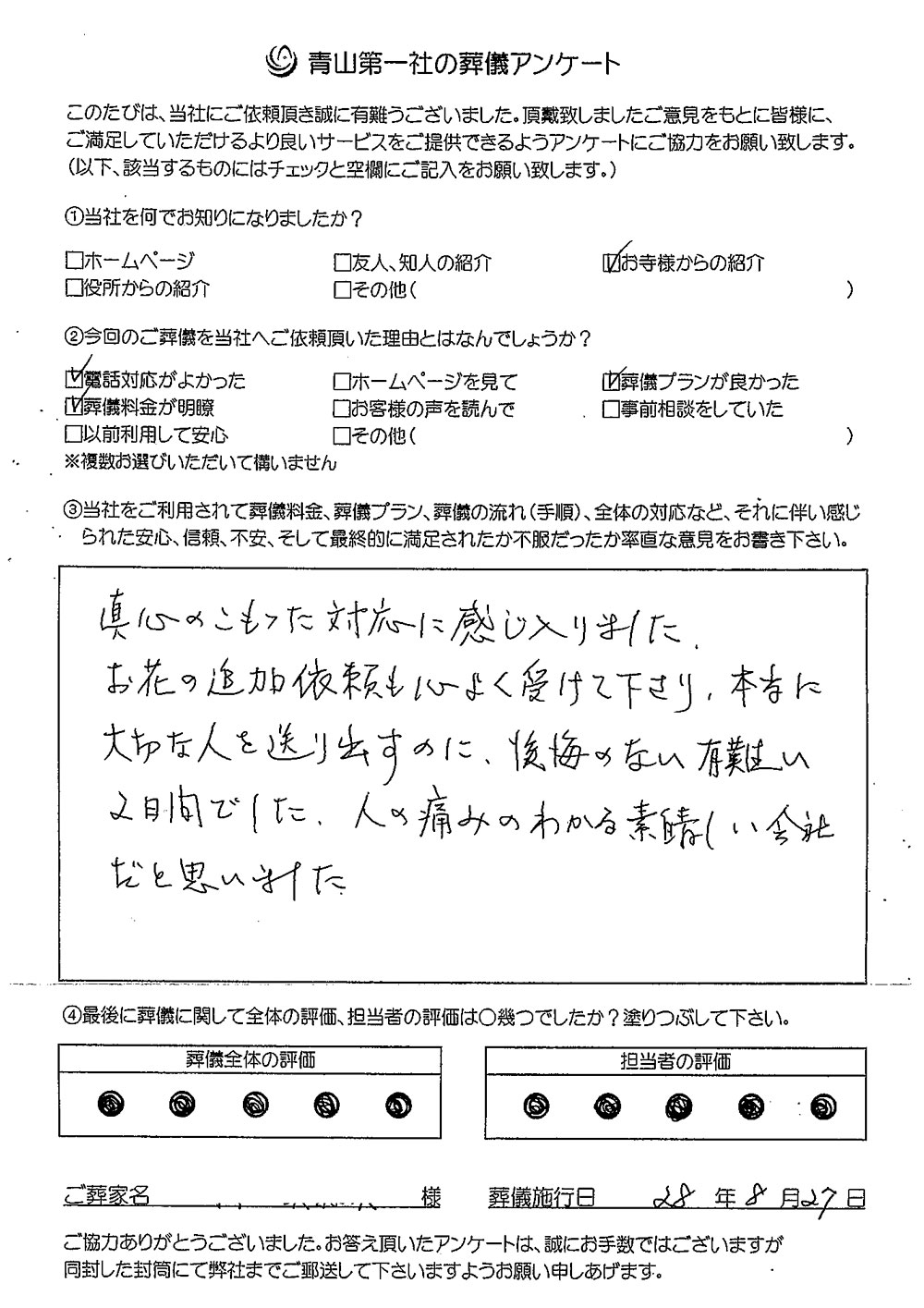 「第一社」では、経験豊富な葬儀セレモニースタッフが、担当者を変えずに最初から最後までお手伝いしますので、不安なことは全てお答えすることが出来ます。