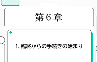 6-1. 臨終からの手続きの始まり「亡くなった後、何をすればいいの?」と不安を抱く人は多いものです。しかし実際には法律に基づいた手続きがあり、順序を守…